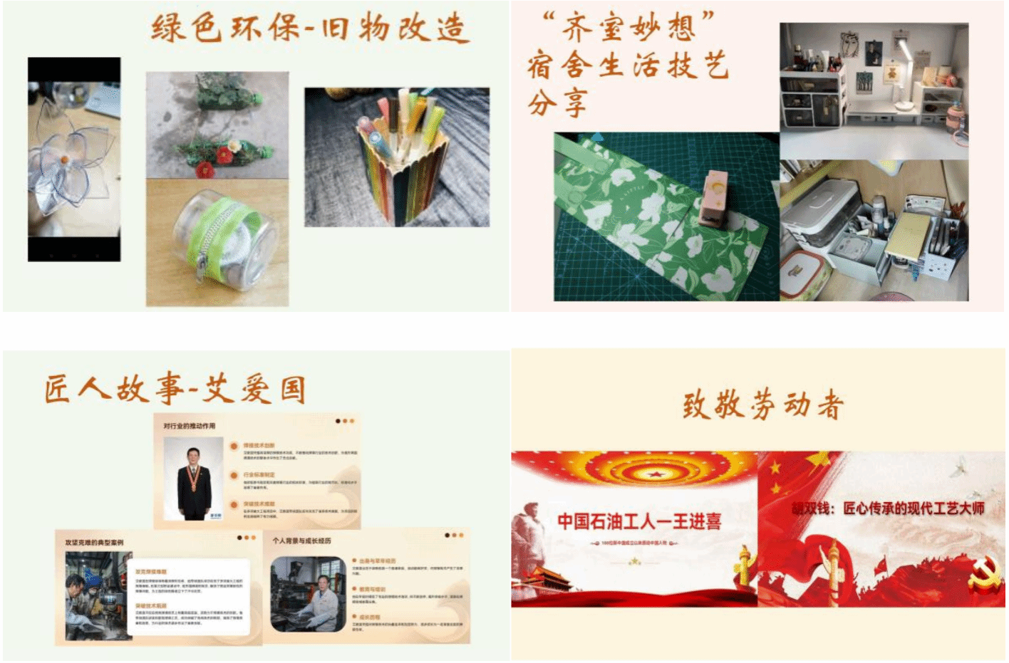 在社会实践中,各学习小组围绕“匠心建筑”调研、“匠人故事”分享和“匠造文化”实践开展活动,深刻领悟工匠精神,向劳动者致敬学习。绿色环保-旧物改造活动和“齐室妙想”宿舍生活技艺分享活动将所学知识付诸实践,充分发挥自己的专业特长。