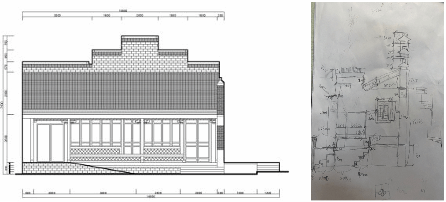 实习现场,工作严谨而有序。同学们分组进行测绘工作,有手持专业工具,专注丈量建筑立面细节;有依据测量数据,将建筑的形制与结构精准转化为立面图和大样图上的线条符号;有负责整体流程协调,确保测量与绘图环节高效衔接。面对高处墙体难以触及的测量难题,同学们集思广益,采用卷尺参照+多角度拍照取样+门高数据整合”的复合方法,显著降低了传统估测的误差。