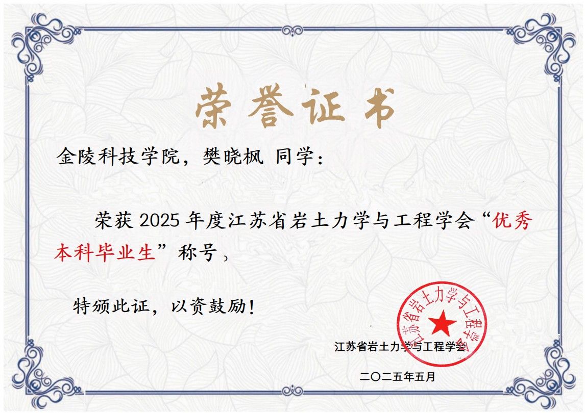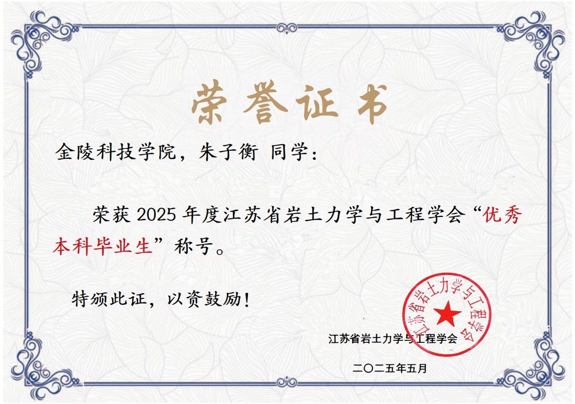 江苏省岩石力学与工程学会“优秀本科毕业生”评选是省内岩土力学与工程领域极具权威性的学生荣誉,旨在激励省内高校相关专业学子刻苦钻研、争先创优,助力加强学科专业建设,为行业培养输送更多符合社会发展需求的优质人才。评选需经过院校推荐申报、学会形式审查、专家评审等多轮严格筛选,本年度全省仅评选出少数优秀学子,竞争十分激烈。