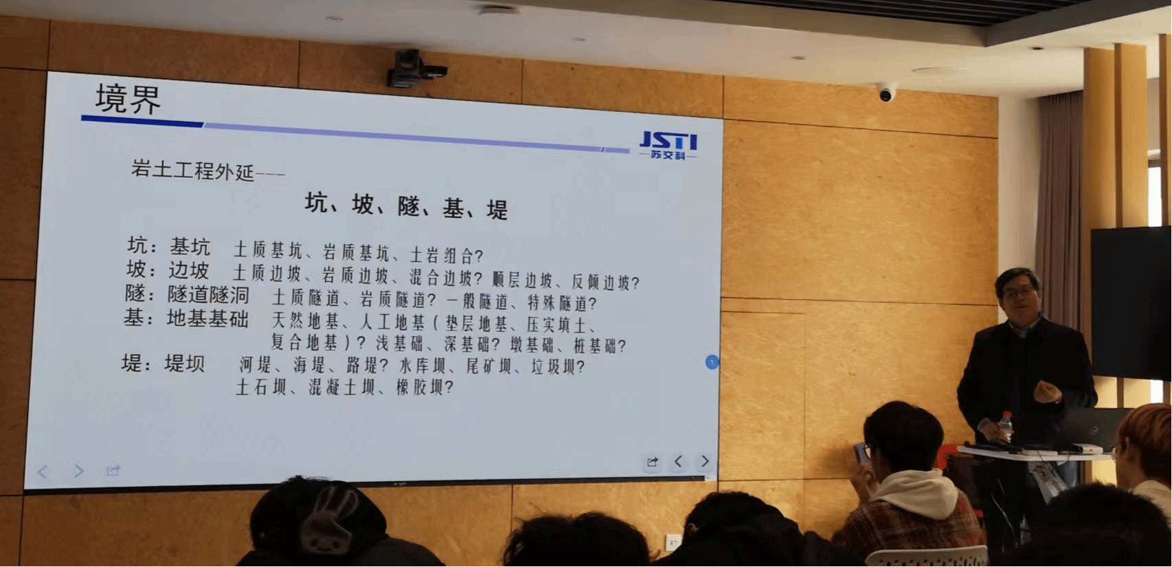 刘教授的讲座中还深入探讨了岩土工程中的外延,包括与岩体、士体、水体和气体相关的工程部分,例如坑、坡、隧、基、堤等。他提到了岩土工程中与岩体、士体及其所包含的水体和气体的利用、改造、控制等密切相关的工程部分,强调了这些外延领域在岩土工程中的关键性。