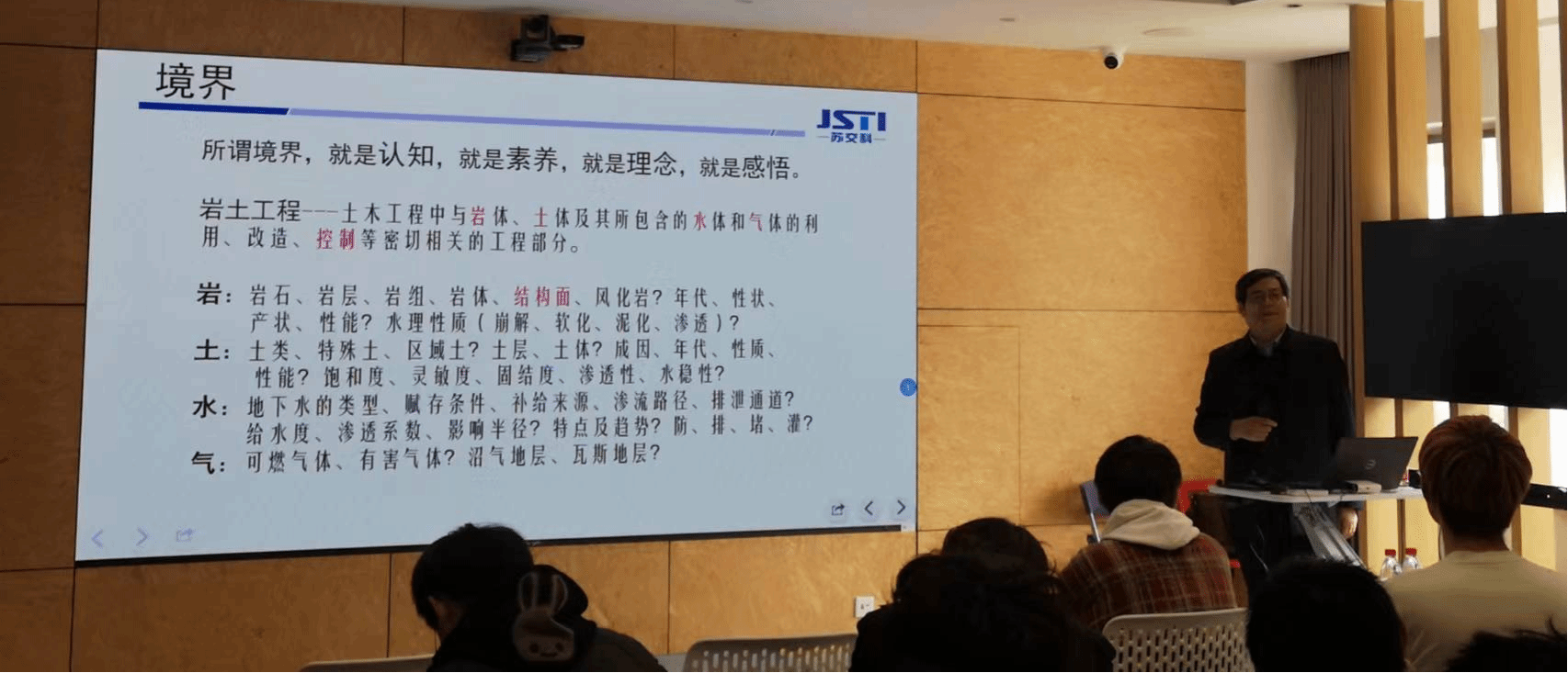 “境界”是刘传新教授提到的关键词,他将其定义为认知、素养、理念和感悟。他强调岩土工程领域需要具备高度的认知水平,需要培养学生在设计中的素养,注重理念的引导和对工程的深刻感悟。