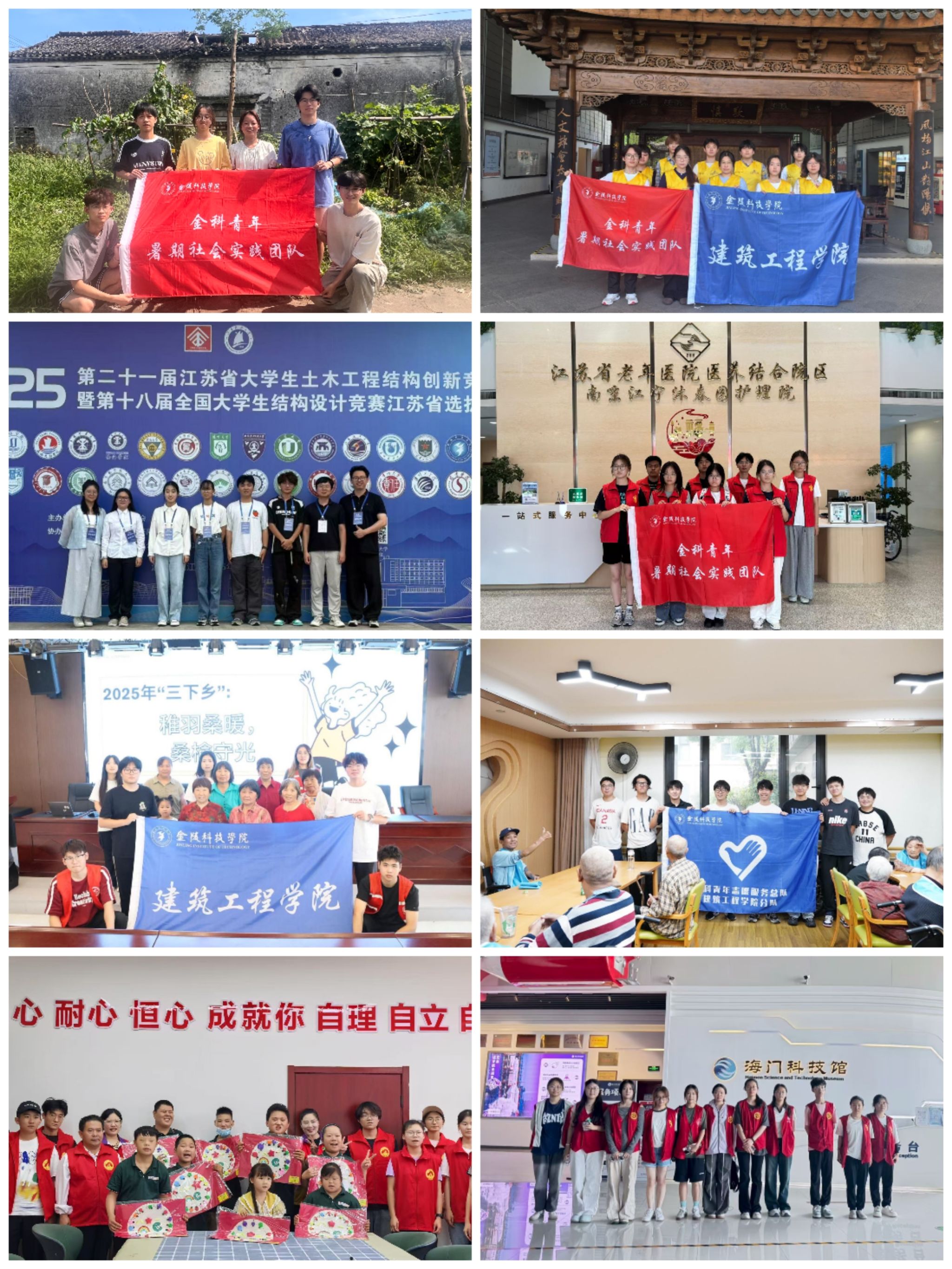 其余各团队围绕爱国主义教育、科技创新、寻访校友等多个领域开展了形式多样、内容丰富的实践活动。“追寻先辈足迹,弘扬爱国精神”等多个爱国主义教育团队分赴南京、徐州、上海、靖江、兰州等地的红色教育基地与纪念馆,通过沉浸式参观、志愿讲解、口述史采集、海报宣传、情景课堂、历史研讨、仪式教育、志愿服务等多种形式开展了爱国主义教育实践活动;“乘前辈之志,启后浪之航”优秀校友寻访该团队通过走访访谈的形式,赴多地深入挖掘在建筑、规划、土木等领域优秀校友的成长故事,旨在感悟专业使命、传承工匠精神;“微光筑基,筑梦青苗”基层服务实践团队以“走进工厂一线,助力产业发展”为目标,赴制造业工厂的生产与技术部门开展了暑期实习与工艺流程优化等实践活动。整体活动充分发挥学院专业特色,引导学生在服务社会、了解国情中锤炼本领,传承使命,展现了青年学子昂扬向上的精神风貌与务实担当。