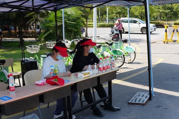 早上8:30,大家将桌椅排好、摆好物资、带上小红帽和口罩,一天的工作就开始啦。