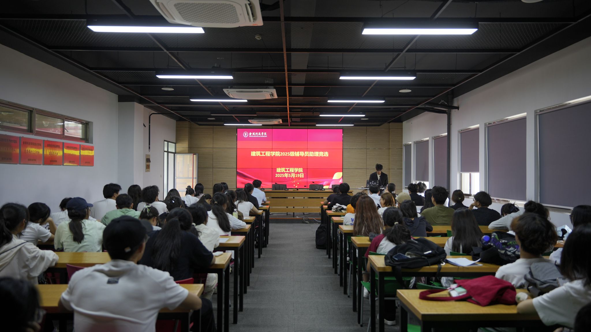 于5月19日在工科楼b513举办2025级辅导员助理选拔会。学院学工办主任鲍飞豹、团总支书记、学工办副主任鲁瑶、辅导员姜艳担任评委,共有20余名优秀学子参与竞聘。