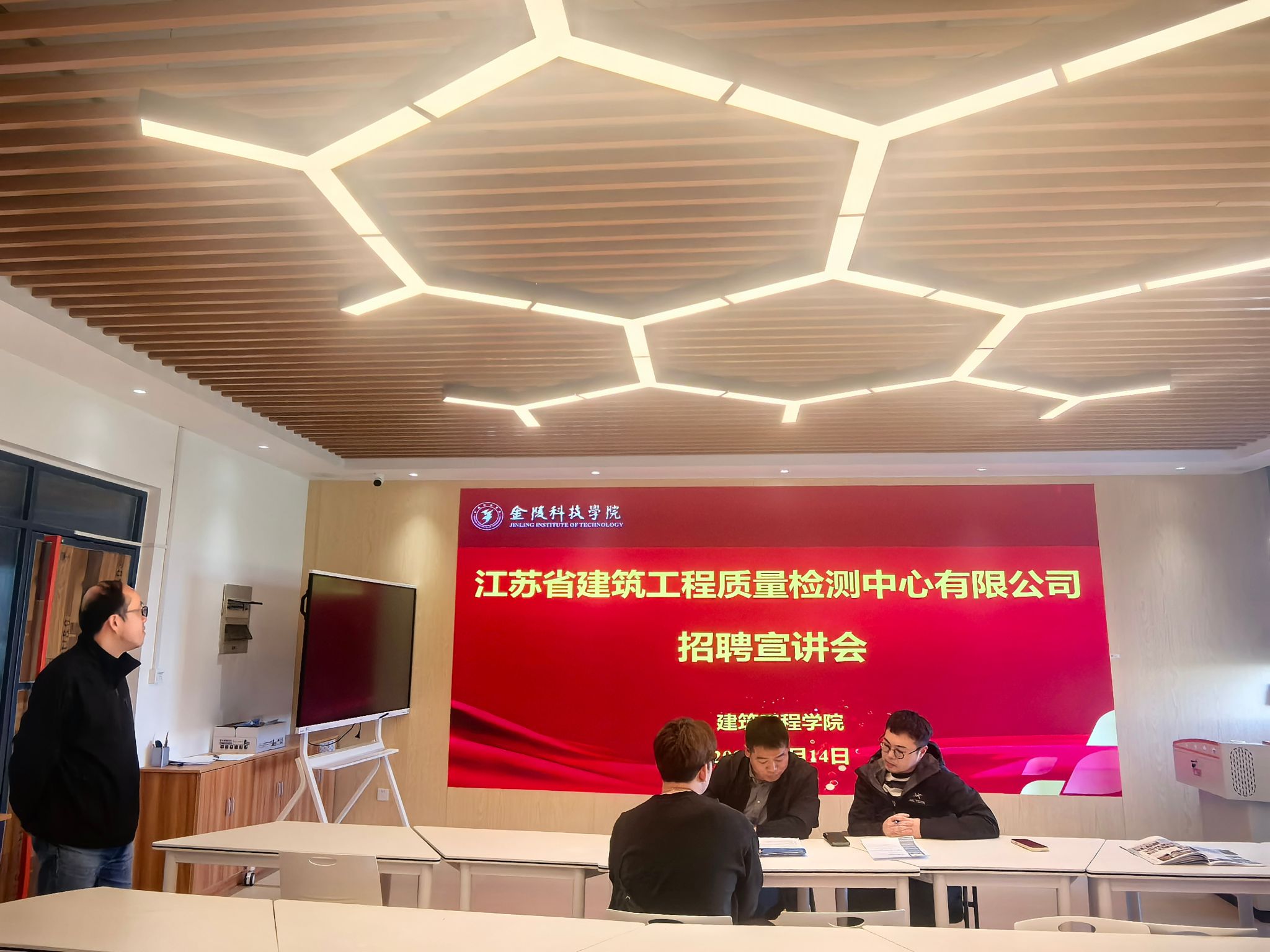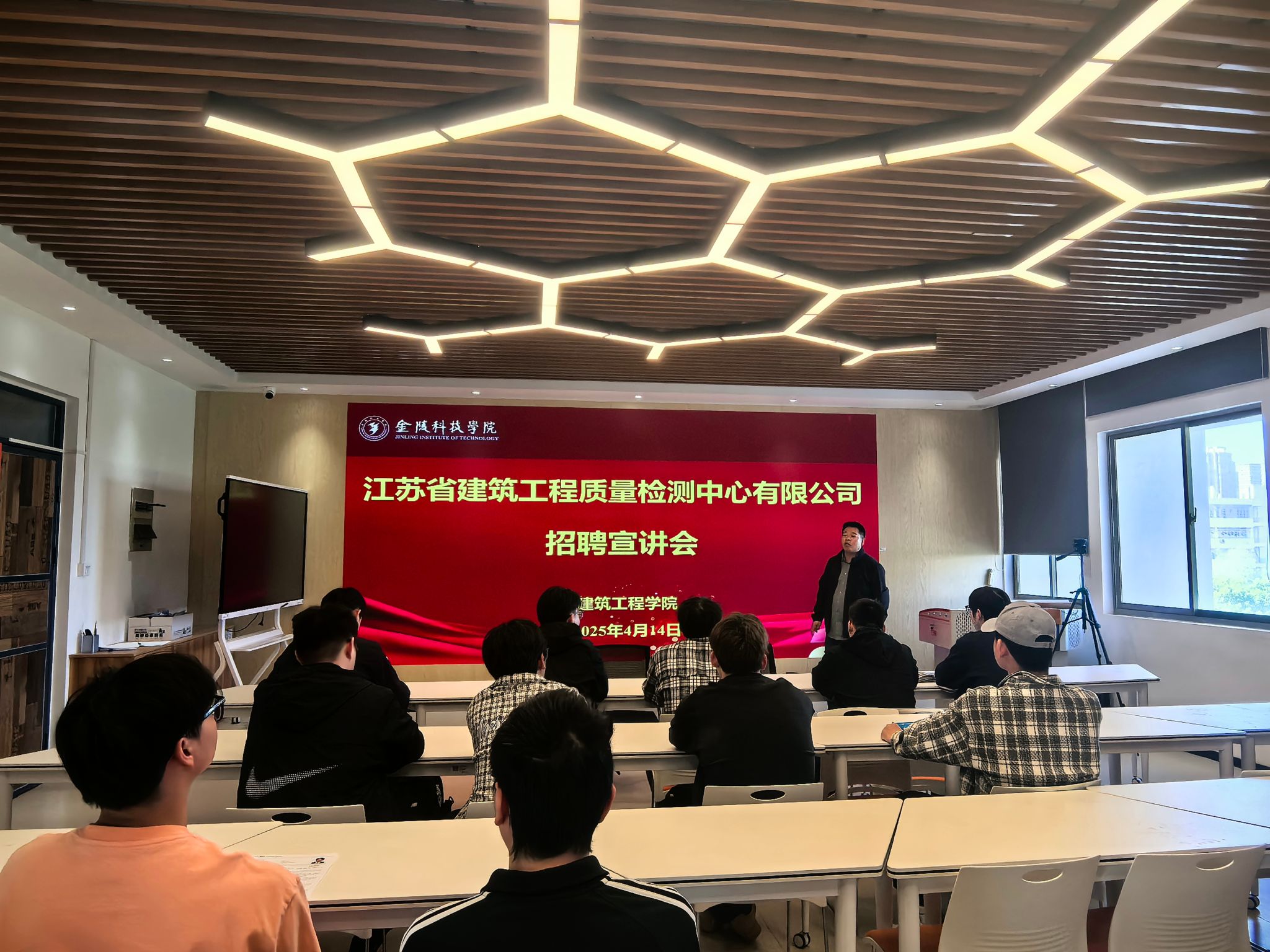 在工科楼b409举办江苏省建筑工程质量检测中心有限公司专场招聘宣讲会。学院党委副书记郑庆秋、学工办主任鲍飞豹及部分2025届毕业生参会。