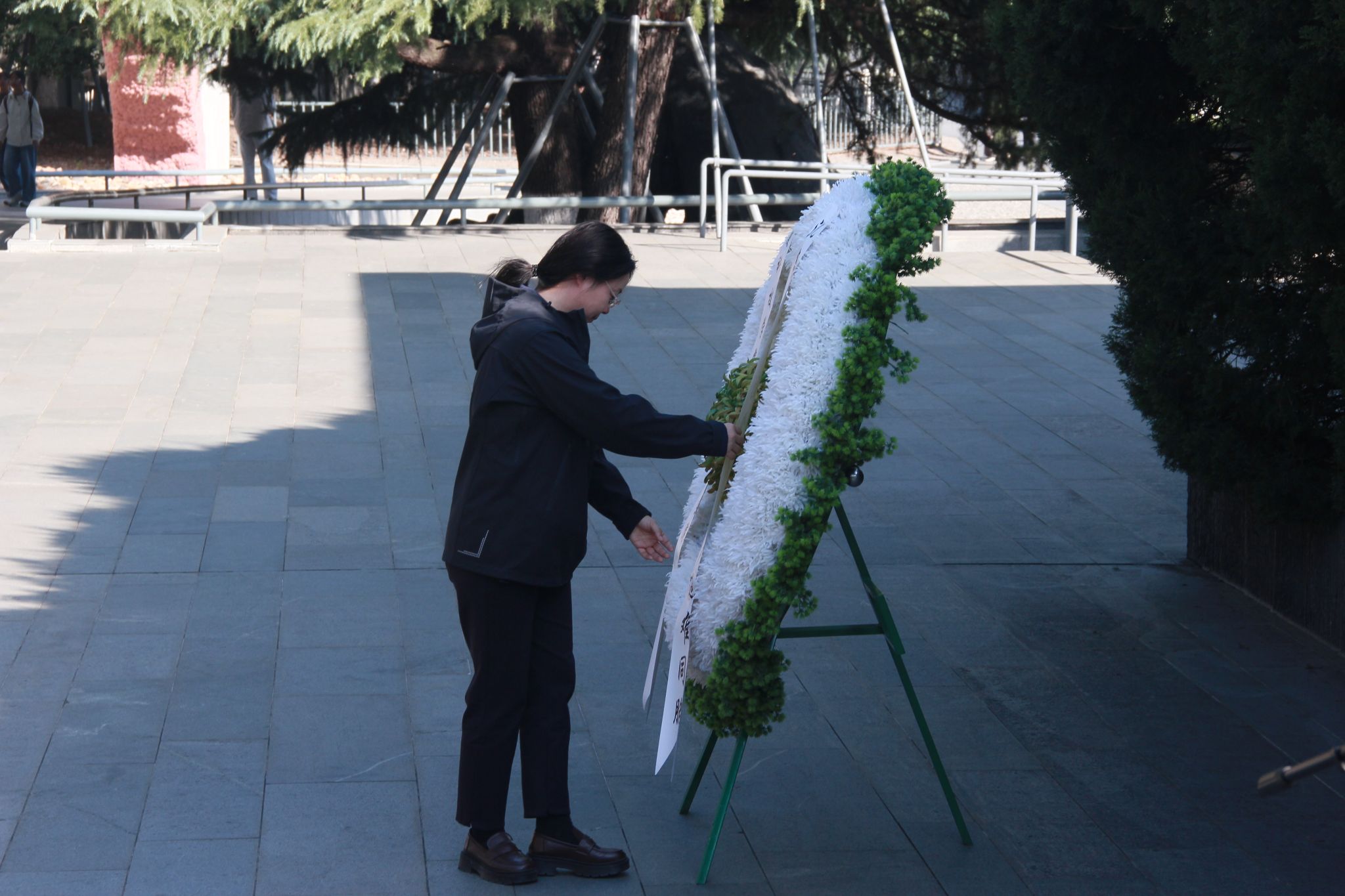 下午2时,全体党员佩戴党徽,怀着沉重肃穆的心情走进纪念馆。在悼念广场前整齐列队,学院党委书记杨如丽整理缎带,带领师生党员向“哭墙”遇难者姓名墙敬献花圈,师生党员在300000余遇难者姓名构成的黑色花岗岩墙面前,向遇难同胞默哀一分钟。