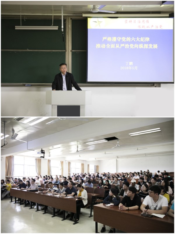 会上,丁书记以“严格遵守党的六大纪律,推动全面从严治党向纵深发展”为主题做报告。他从全面从严治党的背景入手,介绍了十八大以来全面从严治党取得的成就。丁书记提出,全面从严治党最根本是要用纪律管住全党,核心是加强党的领导,基础在全面,关键在严;学习《准则》、《条例》要做到“心中有戒”;要以严格执纪保证党纪严肃性。他带领大家学习了《中国共产党廉洁自律准则》和《中国共产党纪律处分条例》,并对违反党的六大纪律行为案例进行分析。