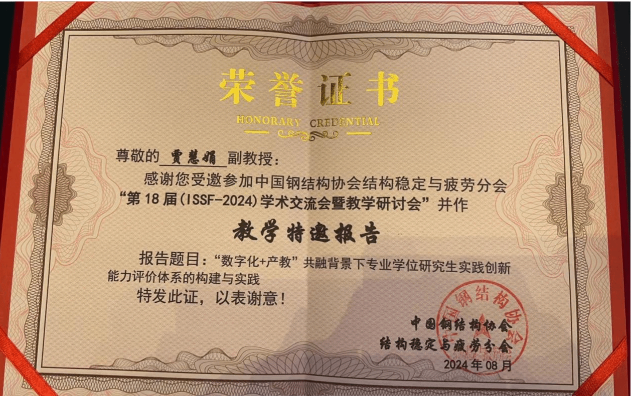 贾慧娟副教授受邀参加了中国钢结构协会结构稳定与疲劳分会和广州大学主办的中国钢结构协会结构稳定与疲劳分会第18届学术交流会暨教学研讨会并作教学特邀报告——《“数字化+产教”共融背景下实践创新能力评价体系的构建与实践》。此次会议汇聚了来自清华大学、同济大学、东南大学等全国各地的知名专家学者、行业精英,共同探讨钢结构专业领域的最新发展和未来趋势。