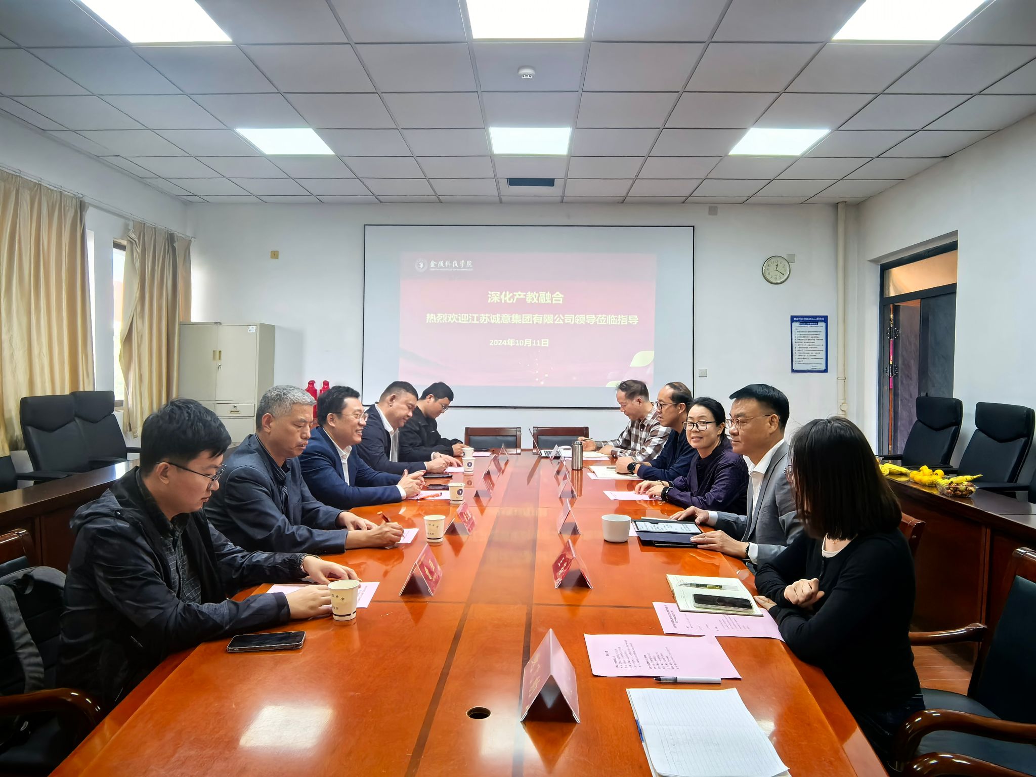 与江苏诚意集团有限公司宣传片,刘志峰详细介绍了学院教学、科研、师资队伍以及人才培养等情况,江苏诚意集团有限公司总经理曹永也详细介绍企业的历史、业务板块、校企合作等情况。缪海林教授详细汇报了产教融合在科研目标设定、科研成果产出、产品研发以及预制构件在水利工程应用等方面的实际情况。在自由交流环节,双方围绕深化产教融合展开了热烈讨论,在坚守国家绿色建筑、节能环保发展理念、致力于产品的生产自动化、打造绿色建筑产品、走产品装配式工业化道路方面达成共识。面向建筑各行业不同领域和不同类别岩土场地环境,运用多种先进技术,对现行预制构件产品进行深度研发与不断创新,创造出新一代安全可靠、生产制作简单、施工操作方便、产品质量可控与可检的预制装配式构件,为实现国家可持续发展战略和行业先进性贡献应尽的责任和力量。此外,双方还就预制构件在水利工程上的应用、毕业生就业等方面进行了探讨交流。