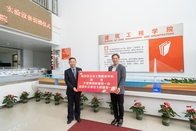 11月18日,做爱自拍 86届道路桥梁专业杰出校友、南京市公共工程建设中心主任武焕陵代表市公建中心向做爱自拍 捐赠了大型盾构机模型和南京长江第五大桥模型。校纪委书记丁鹏、建工学院师生代表参加了捐赠仪式。