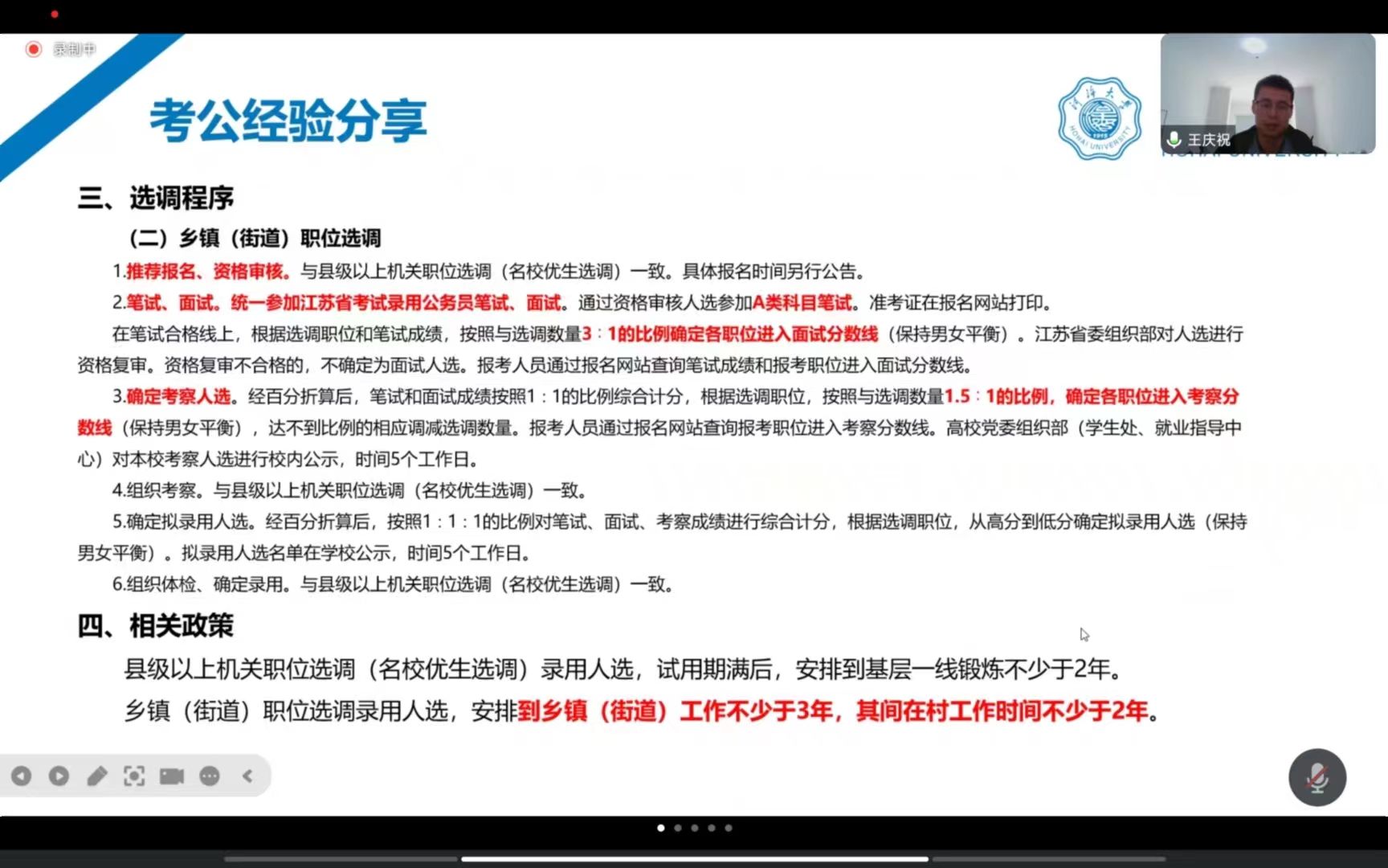 学长王庆祝,2019年毕业,来自江苏省泗洪县汤沟镇人民政府,四级主任科员,他首先从“什么是选调生”切入主题,并介绍了自己的考公选调经历,同时结合他自身备考感悟,给同学们分享了备考策略和面试技巧,建议学弟学妹们一定要结合自身实际找准适合自己的方式方法,不畏难,不俱难。